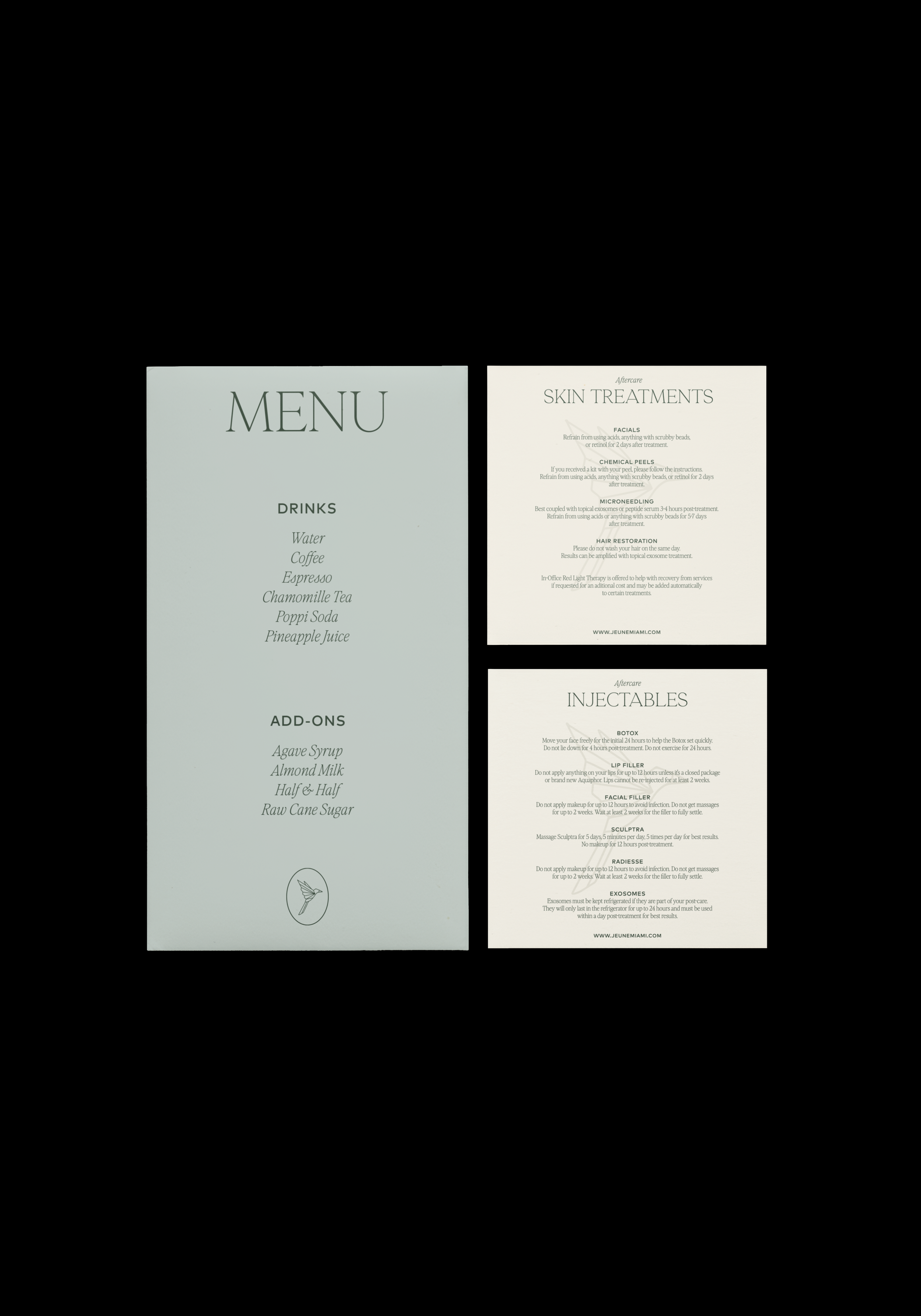 Pamela came to us wanting a brand that felt as considered as their interiors—sophisticated, calming, and quietly upscale—while still holding its own among the fashion houses and galleries next door. Working closely with the interior designers, we drawing from the warm, modern environment of the space, and developed a refined visual identity and packaging system built around soft neutrals with deep emerald accents, and considered textures. We paired that palette with custom wordmarks, decor-inspired iconography, and editorial typography that signal high-end, results-driven care.
