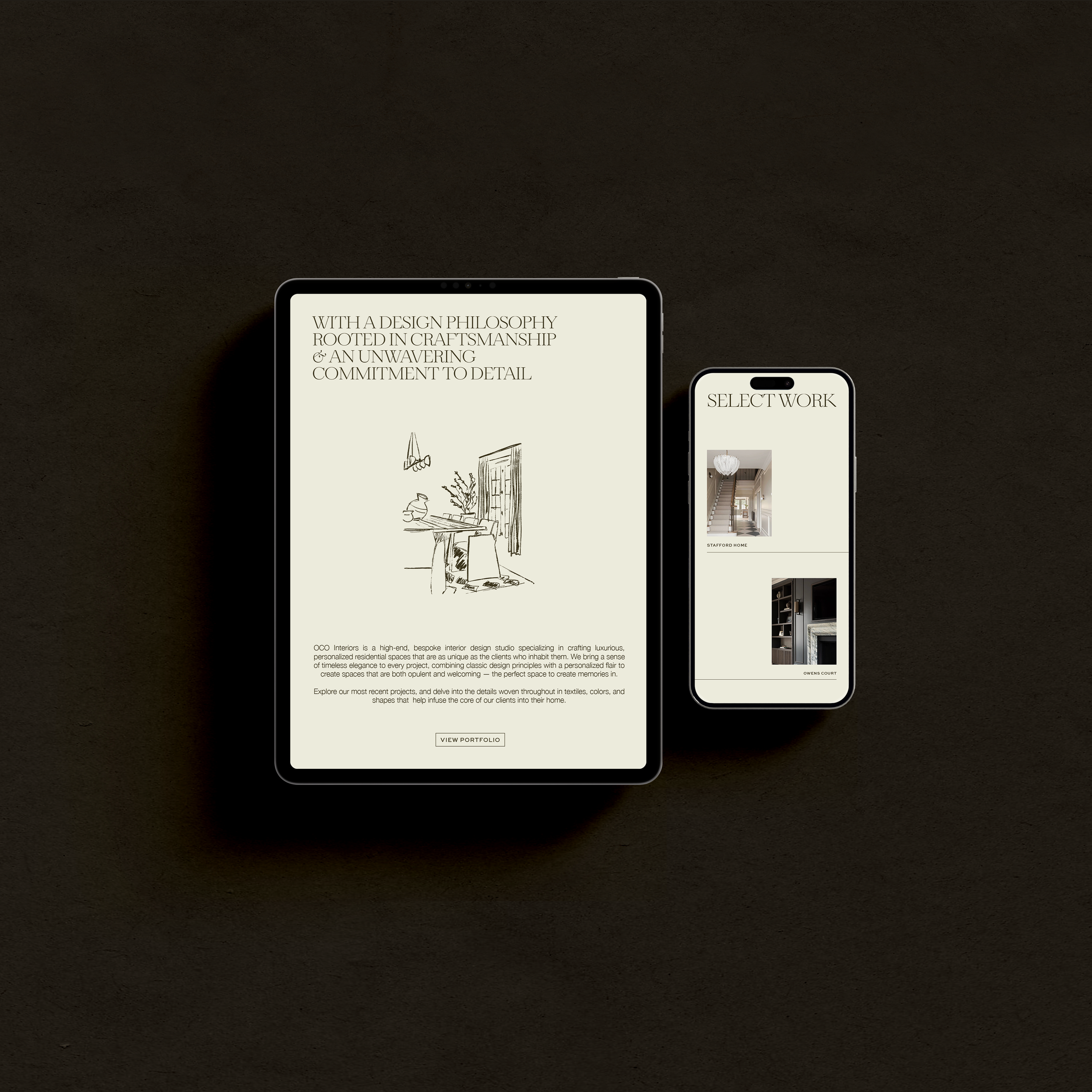 Based in Northern Ireland, OCO Interiors is a bespoke residential design studio dedicated to redefining luxury living through intentional, deeply personal spaces. Rooted in bespoke craftsmanship, exceptionally detailed service, and authentic client relationships, Orlagh came to us in need of a visual and digital presence that matched the quiet opulence of her work.